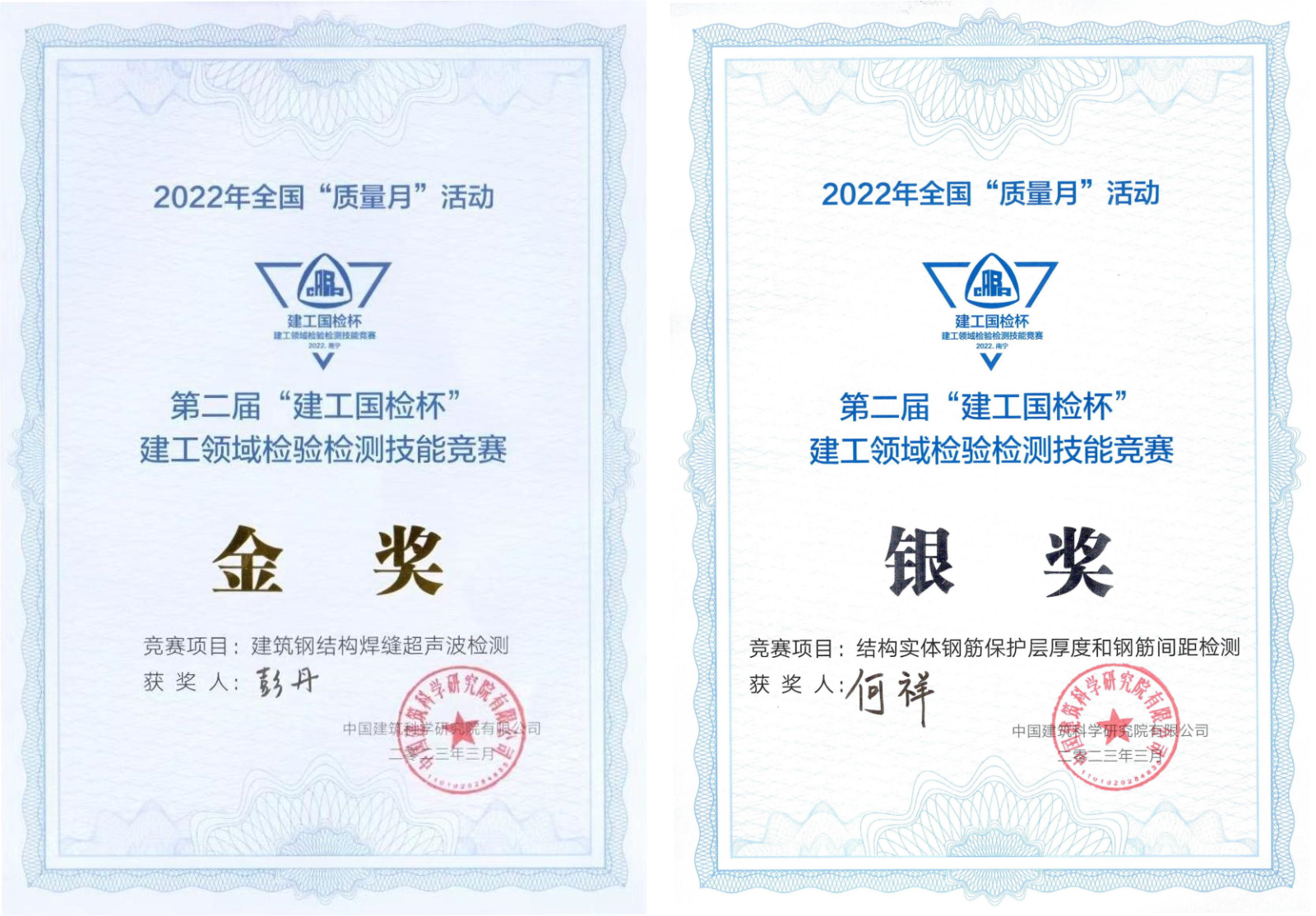 徐建檢測公司彭丹、何祥分獲第二屆“建工國檢杯”2022年度全國建工領(lǐng)域檢驗(yàn)檢測技能競賽金獎、銀獎